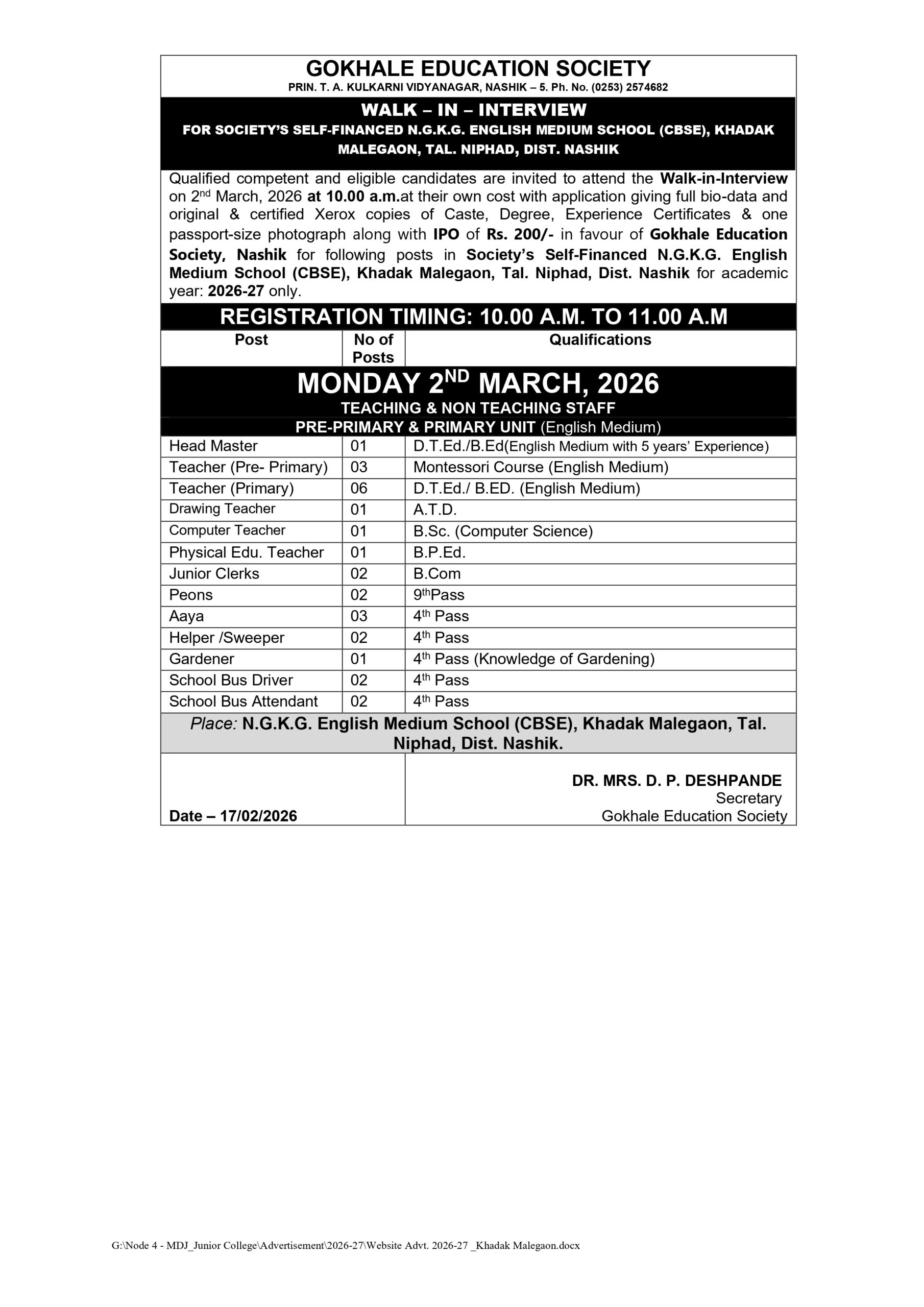 WALK – IN – INTERVIEW For Society’s Self-Financed N.G.K.G. English Medium School (CBSE), Khadak Malegaon, Tal. Niphad, Dist. Nashik at-gesociety2026-02-17T15:14:00+05:30